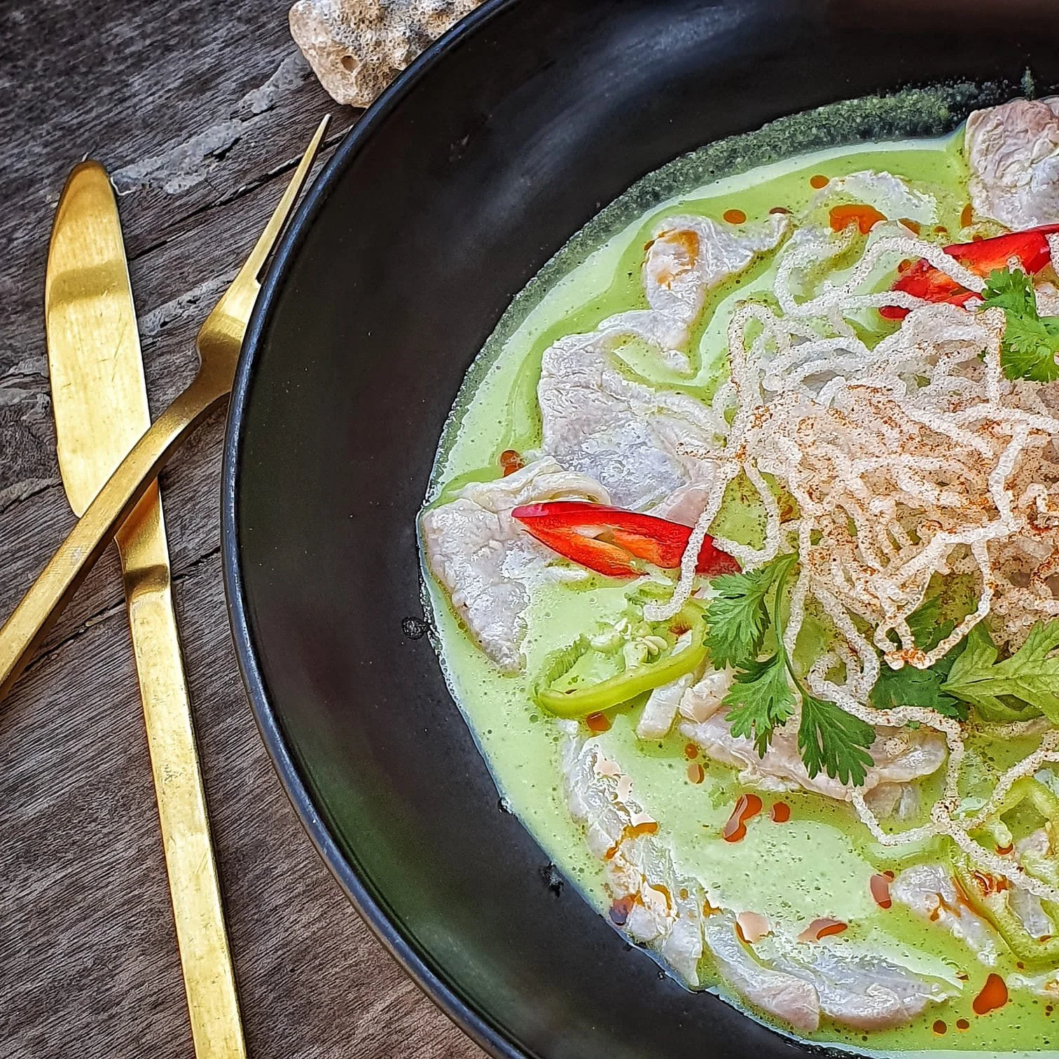 Poisson vapeur, curry coco, citronnelle, cacahuètes concassées et vermicelles frits