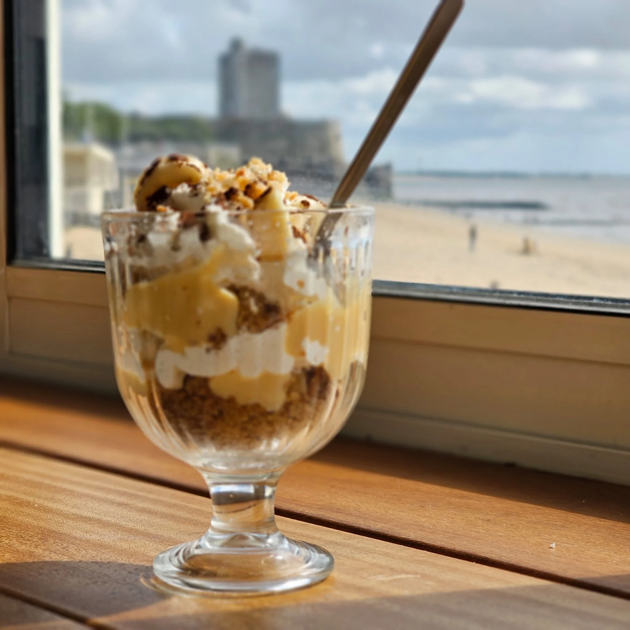 Banane, chantilly fève de tonka, caramel de lait et biscuit croquant à la fleur de sel