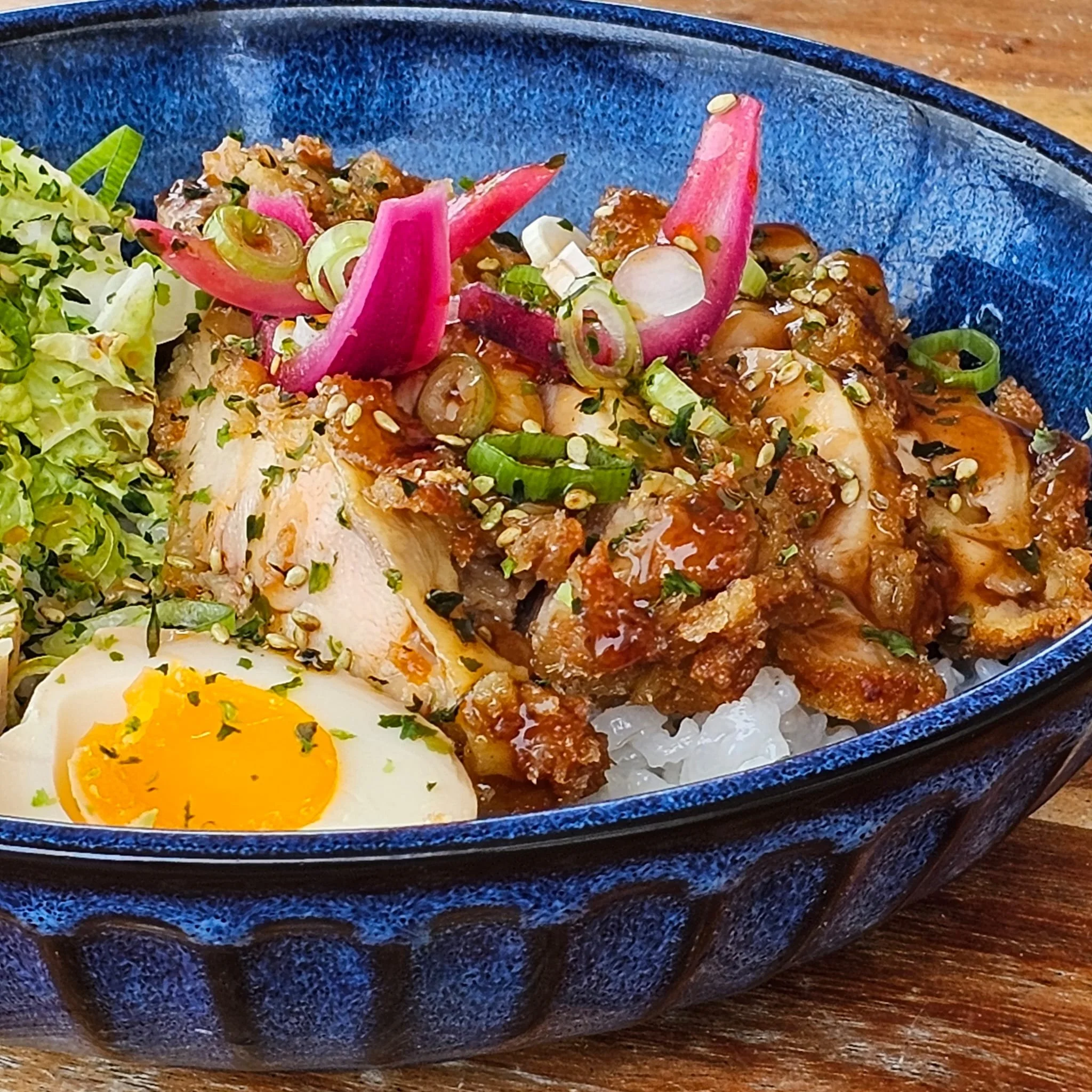 Poulet crispy sauce katsu, oeuf tamago, pickles et herbes fraîches