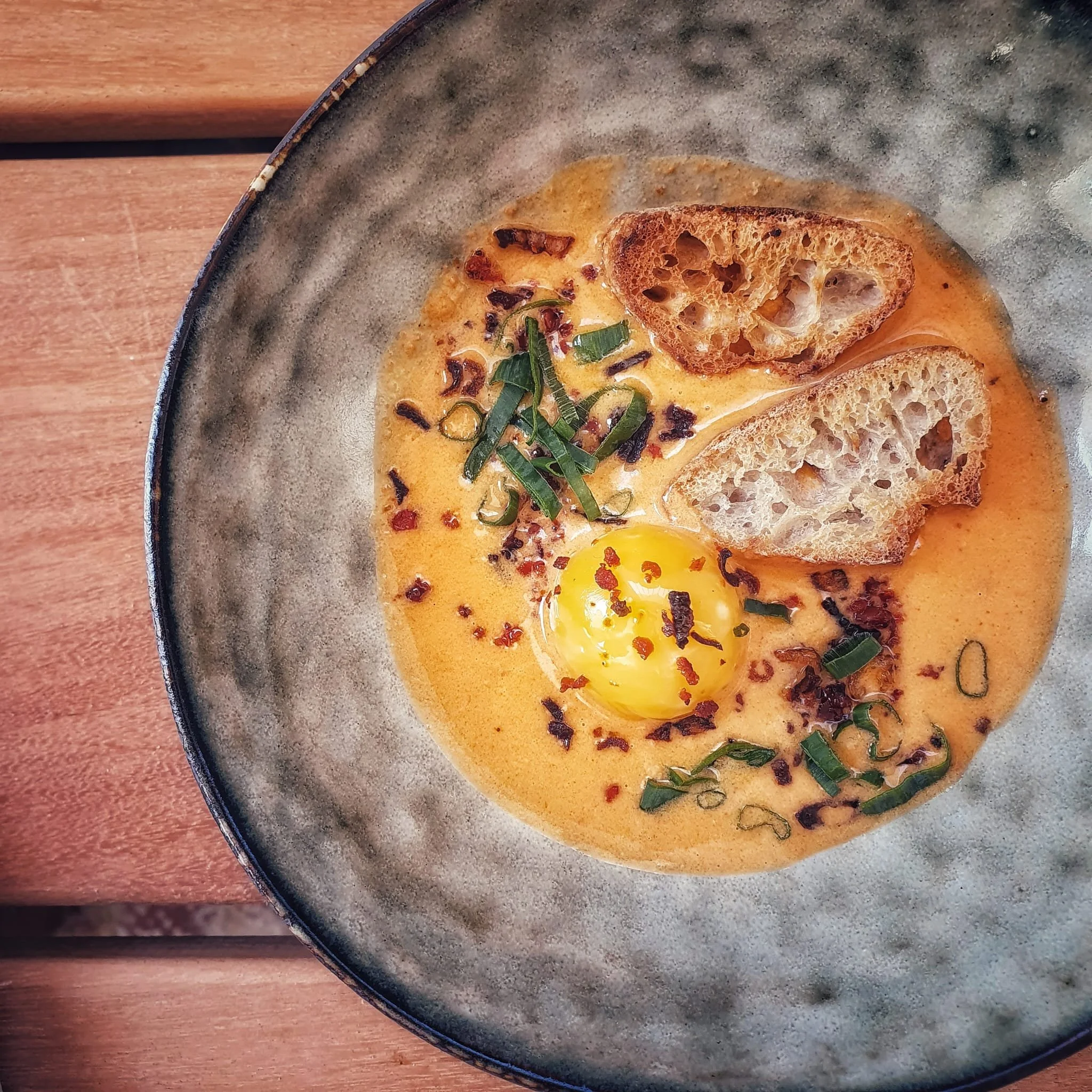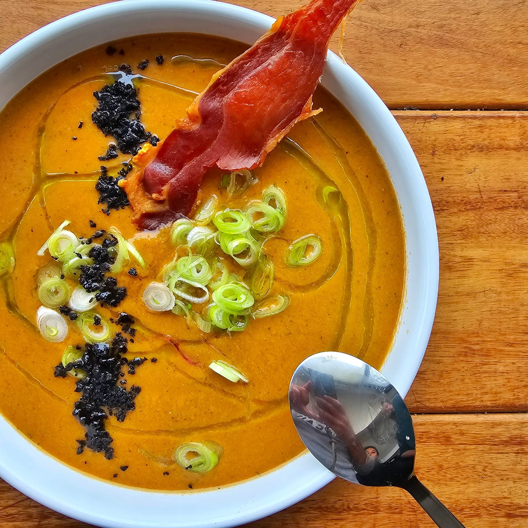 Soupe froide de légumes, chips de jambon, poudre d’olives et herbes fraîches