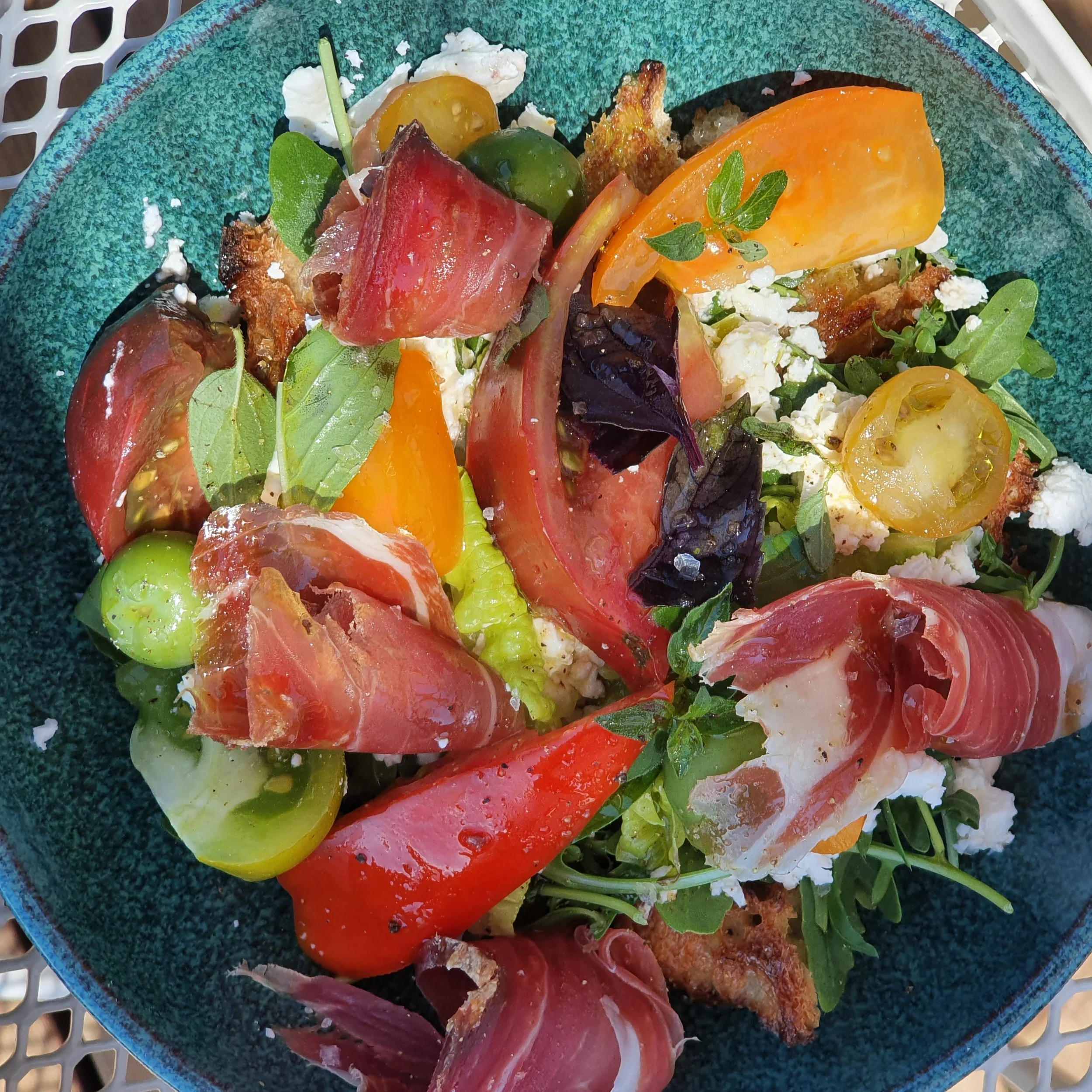 Tomates multicolores, concombres, olives de kalamata, fêta et pain grillé + extra jambon de pays 2,5€