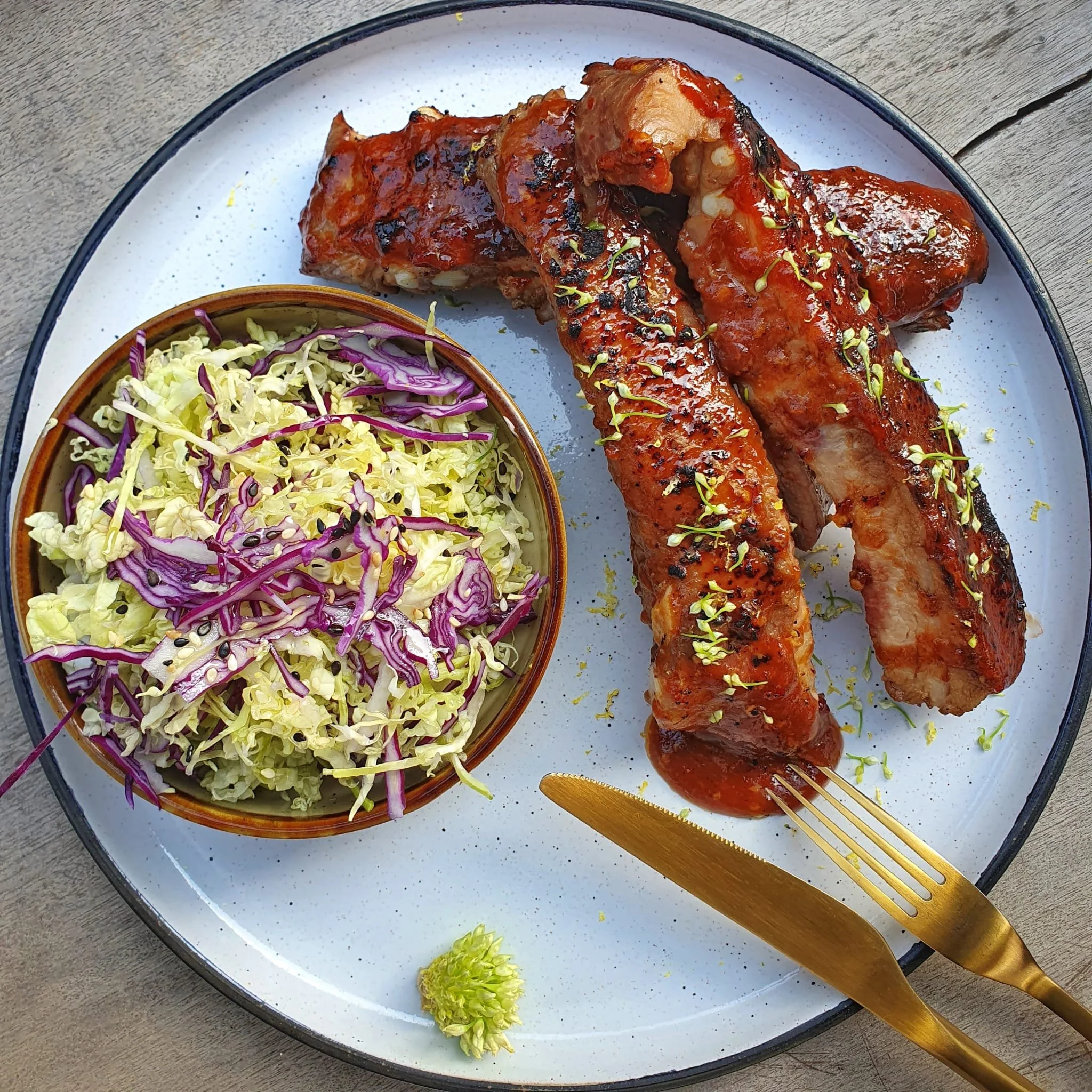 Poitrine de porc confite basse température snackée et sauce BBQ maison