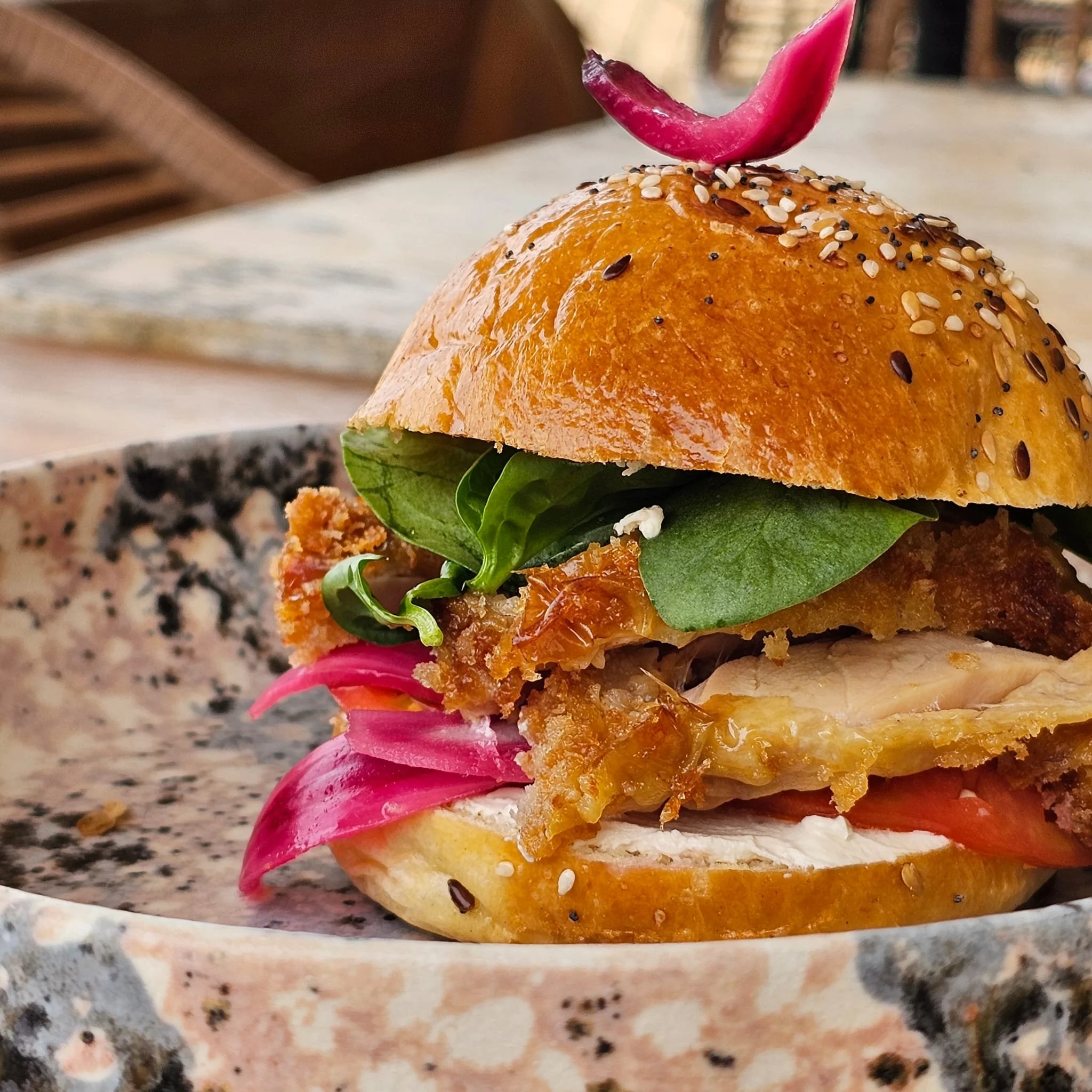 Bun toasté au BBQ, poulet crispy, pousses d’épinards et fromage frais épicé